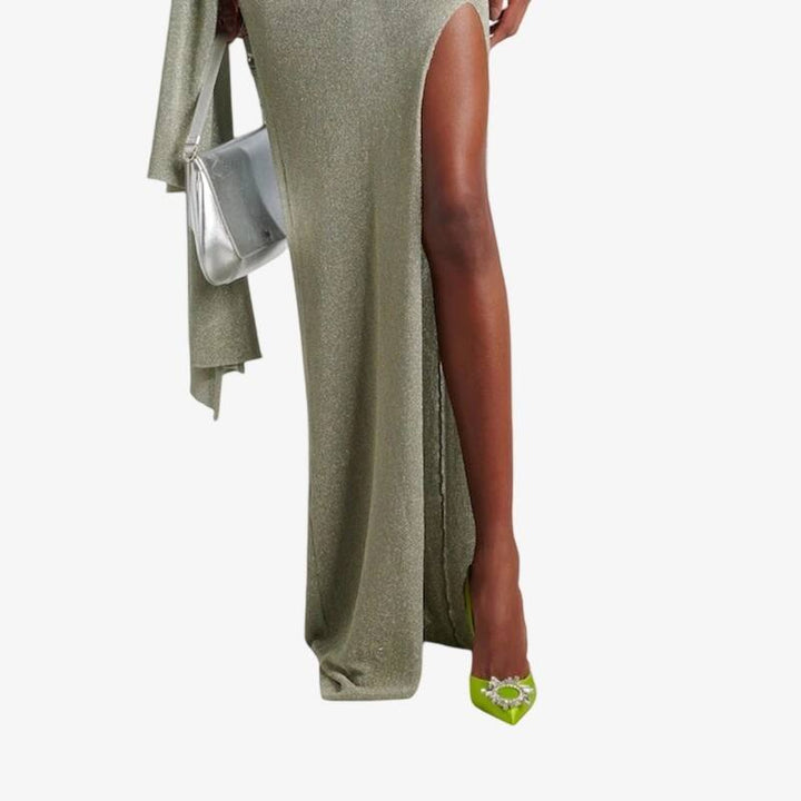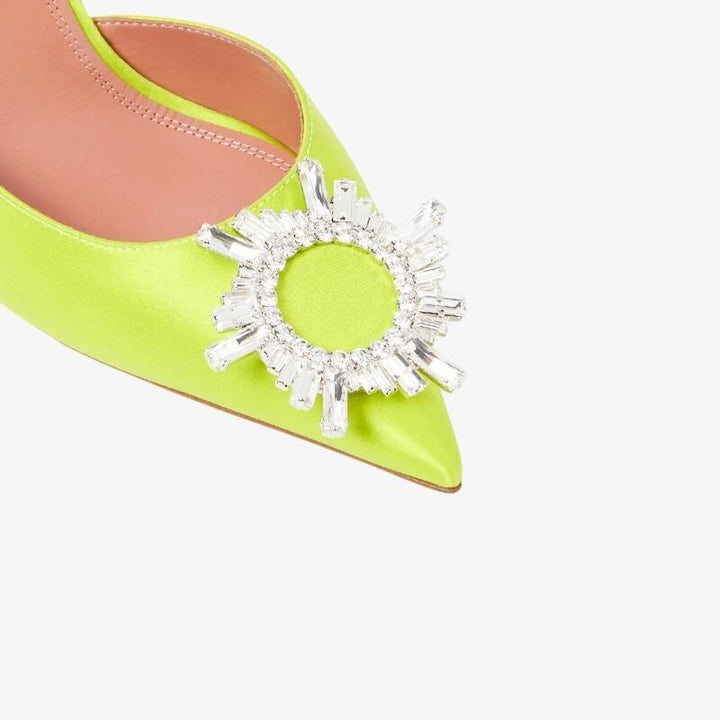 Like emerald silk cascading through moonlight, these lime satin pumps command attention with their liquid-like luminosity. The 95mm heel arcs with architectural precision, while the hidden elastic strap embraces your foot like a whispered secret. At the vamp, a razor-sharp pointed toe elongates your silhouette into pure poetry.