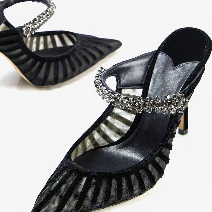 These black pumps feature a mesh fabric upper with elegant embellishments, a pointed toe, and a leather sole. Finished with a blend of fabric and leather lining for added comfort and sophistication.