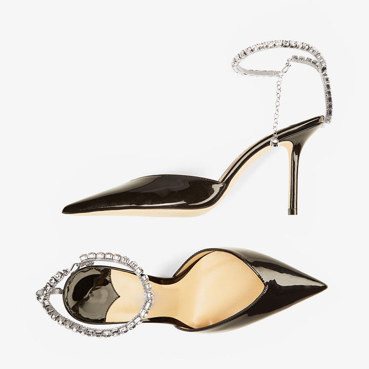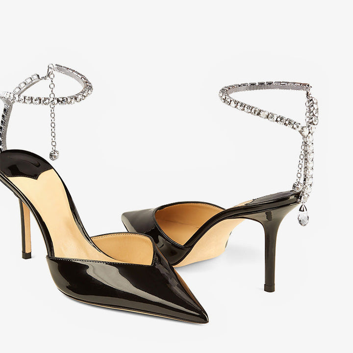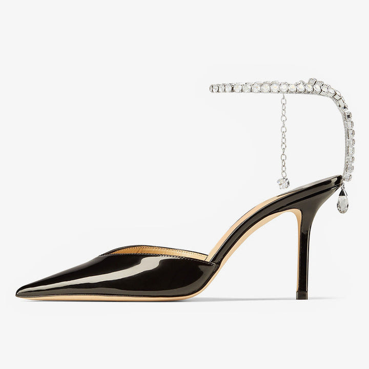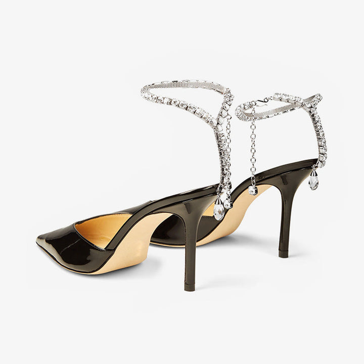 These sleek black patent leather pumps feature a pointed toe and a slim 85mm heel. A delicate crystal chain wraps the ankle, finished with a single drop crystal and embellishments cascading along the heel. Elegant and bold, they bring the sparkle of jewelry to classic footwear.