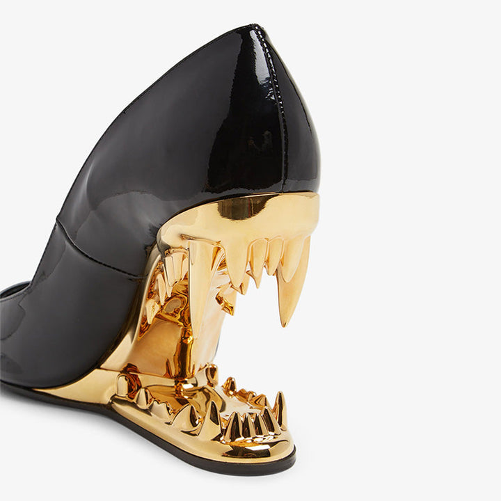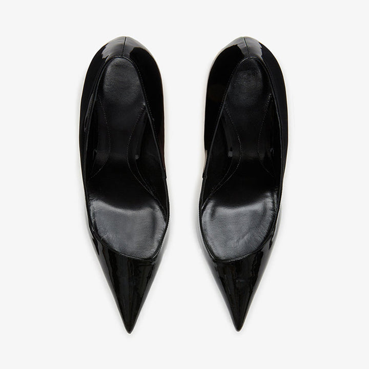 Refined with edge — these black leather pumps feature a mirror-finish gold heel and an asymmetrical cut vamp. Finished with a pointed toe and smooth leather insole for a sleek, sculptural silhouette.Upper: 100% calf leather