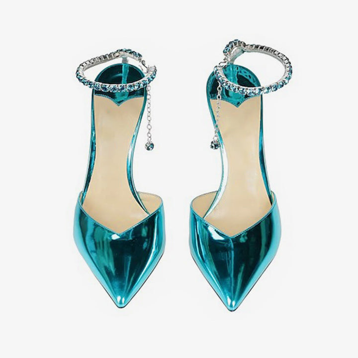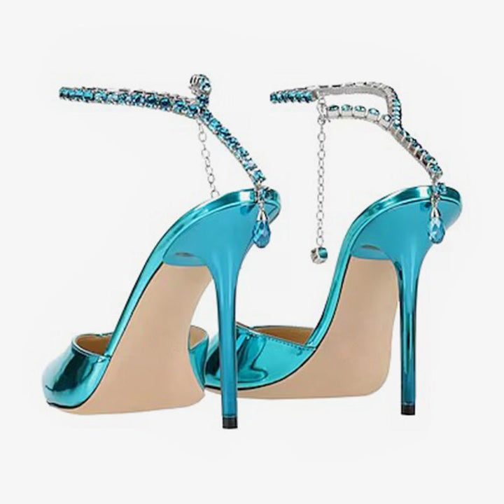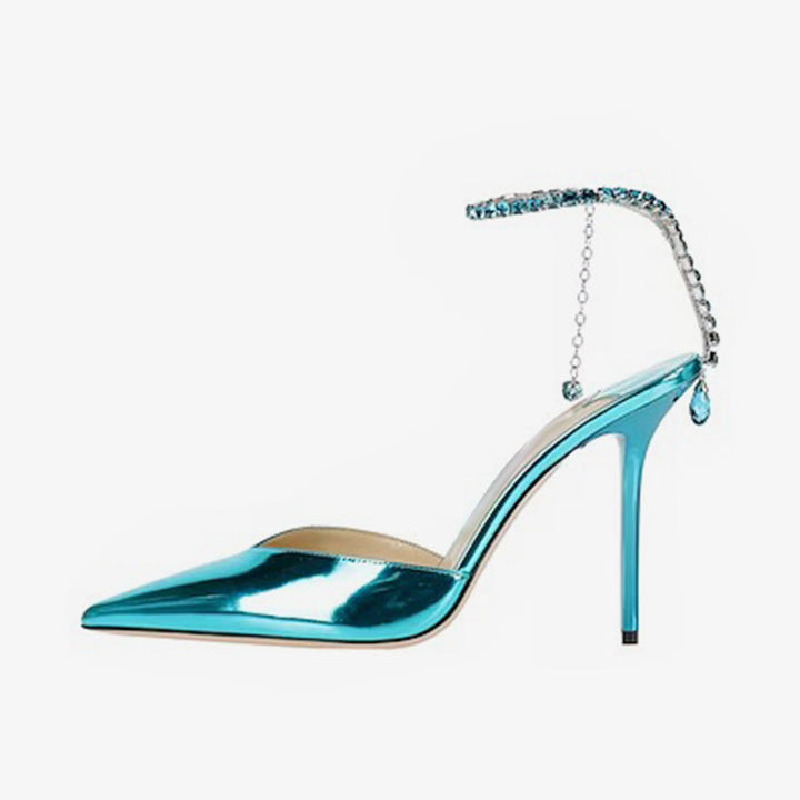 These blue leather pumps feature a pointed toe, buckle-fastening ankle strap, and a covered spike heel. Finished with leather lining and sole, they offer a sleek and bold silhouette with a 100mm heel height.