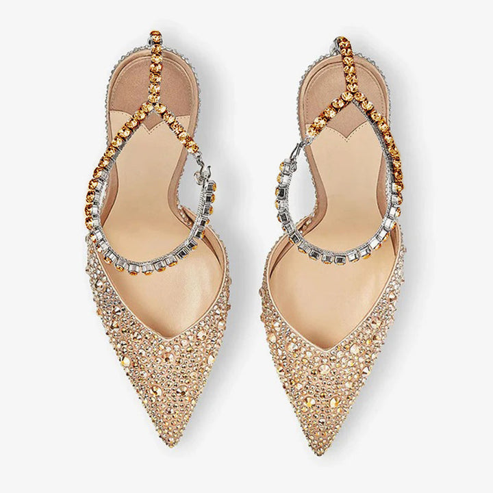 These rose gold satin pumps are embellished with hotfix crystals and feature a hand-finished crystal anklet with a drop crystal at the back. Set on a 100mm stiletto heel, they combine luxurious shine with a secure and elegant fit. The satin finish enhances the shimmer effect, while the delicate rose gold hue adds a modern romantic touch.