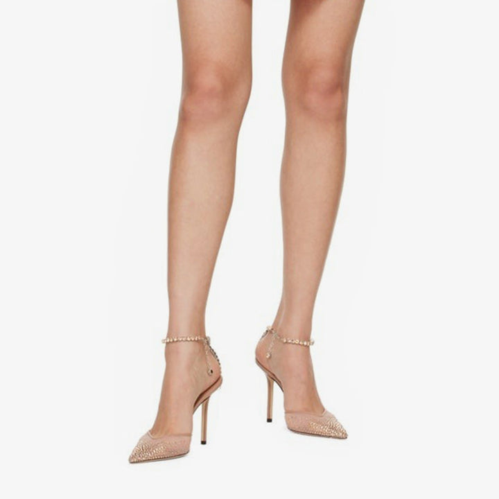Crafted from pink tulle, these pumps are adorned with crystals from the pointed toe to the ankle strap. A delicate crystal chain drapes at the heel, ending in a pear-shaped stone. Finished with a high 100mm stiletto heel and leather sole, they blend elegance with eye-catching sparkle.Color: pink