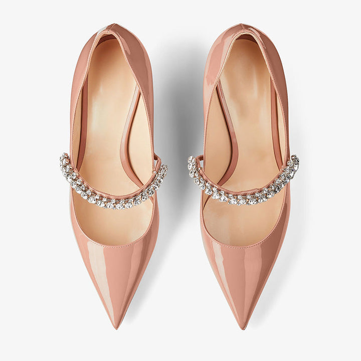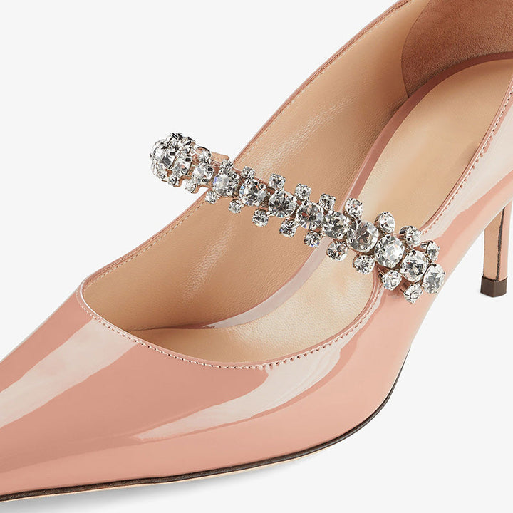 These patent leather pumps in pink feature a pointed toe and a hand-finished strap adorned with individually set crystals. With leather lining and sole, this 65mm style adds refined sparkle to any occasion.