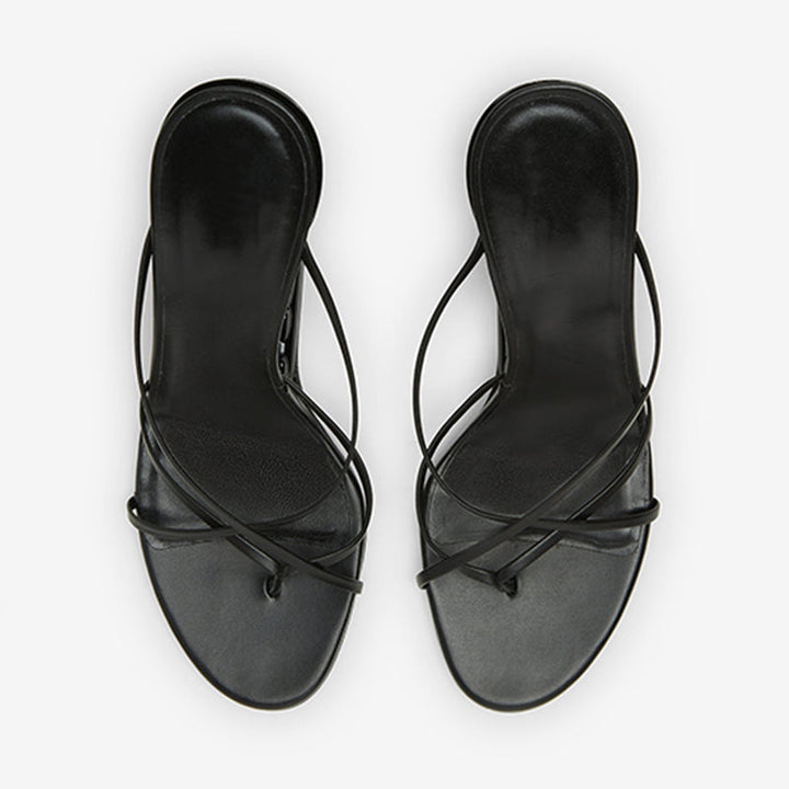 Striking in silhouette and subtle in tone, these black sandals pair a sculptural high heel with minimalist crisscross straps. Crafted with a smooth leather footbed and a rounded toe for bold elegance in every step.Upper: 100% calf leather