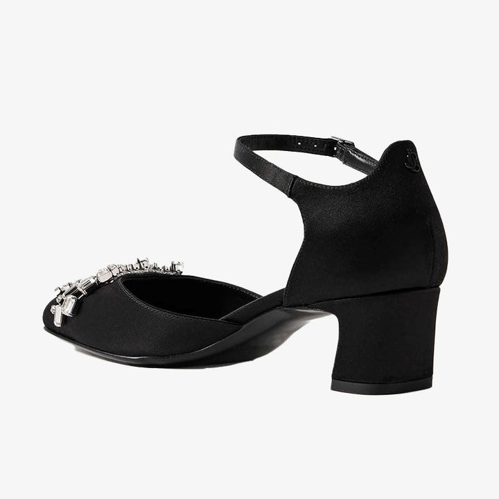 Inspired by classic elegance, these satin pumps shimmer with a radiant crystal adornment at the toe. The refined silhouette is complemented by an adjustable strap for a secure and graceful fit, making them a timeless statement piece for any occasion.The heel height of this pair is 60mm.