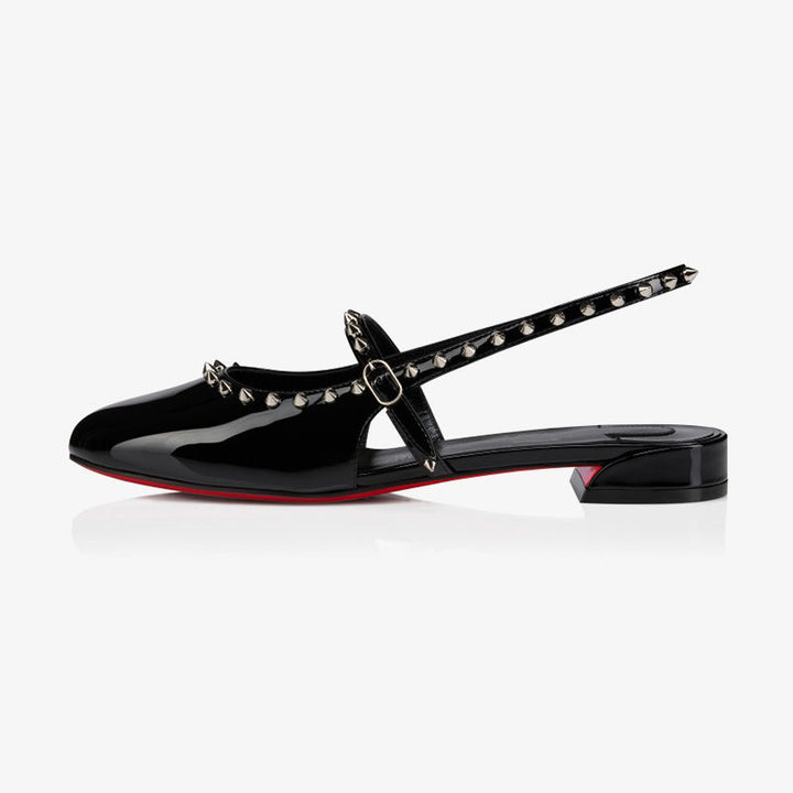 This sophisticated ballerina flat is crafted entirely from black patent material, featuring a slightly rounded toe and a delicate back strap that reveals the foot. Adorned with metallic spikes, a signature detail, it combines elegance with bold edge. The model also features the new "Eternal Red sole," designed with an innovative technique to ensure incomparable durability while preserving the iconic red finish.