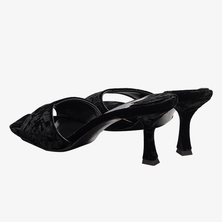 Made from plush velvet, these black mules feature a square open toe, leather lining and sole, and a sculpted 70 mm heel. Designed for a true-to-size European fit, they blend luxe texture with modern silhouette. Color:black