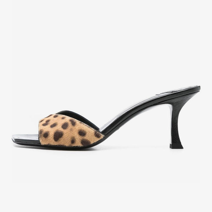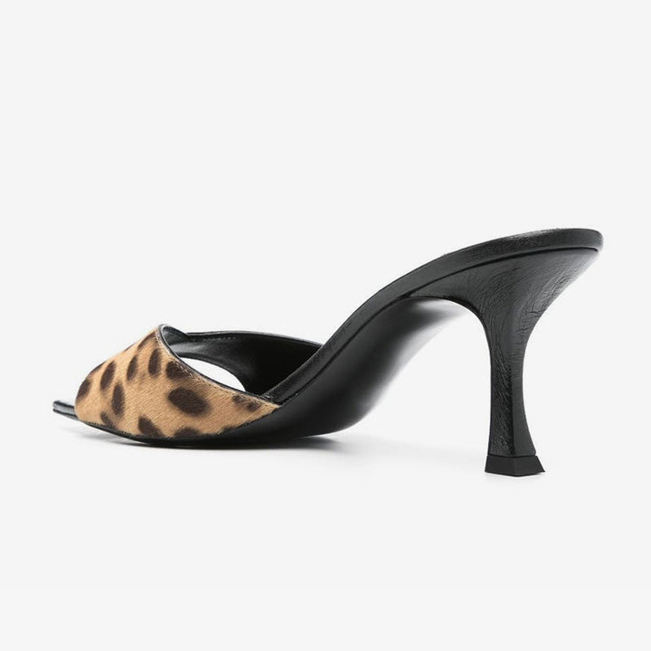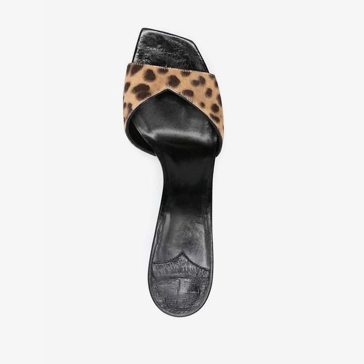 These brown mules feature a square open toe, sculpted 70mm heel, and a leather sole. Crafted from calf hair with a smooth leather lining, they blend texture and elegance in a modern silhouette.