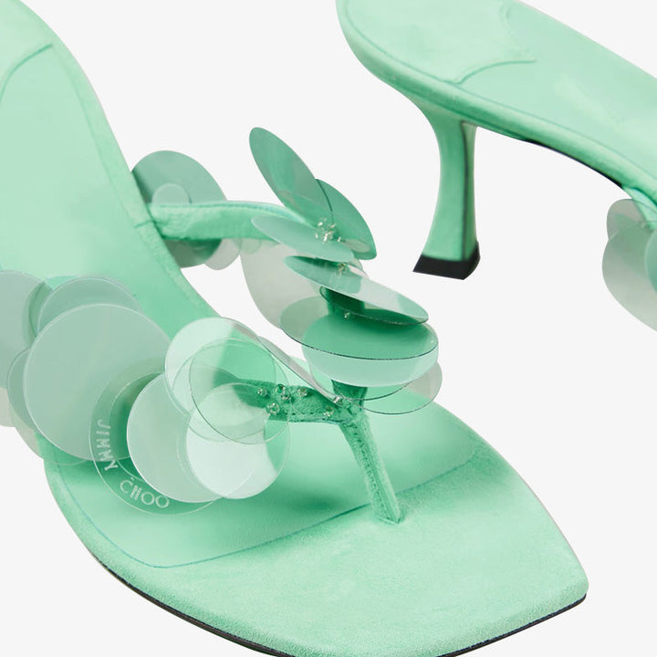 These green suede sandals feature wide curved vamps adorned with a mix of opaque and translucent sequins. Designed with squared soles and fluted 70mm heels, they offer a comfortable slip-on fit with standout style. Color:green