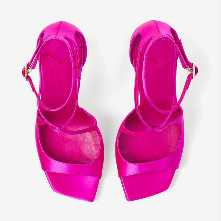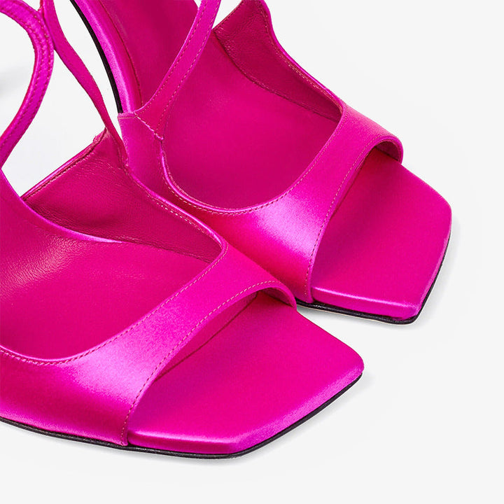 These striking red satin sandals feature delicate curved straps that elegantly wrap up your feet, offering a flattering silhouette. With a slim 110mm heel, square open toe, and buckle-fastening ankle strap, they are the perfect balance of bold and sophisticated. Fits true to size.