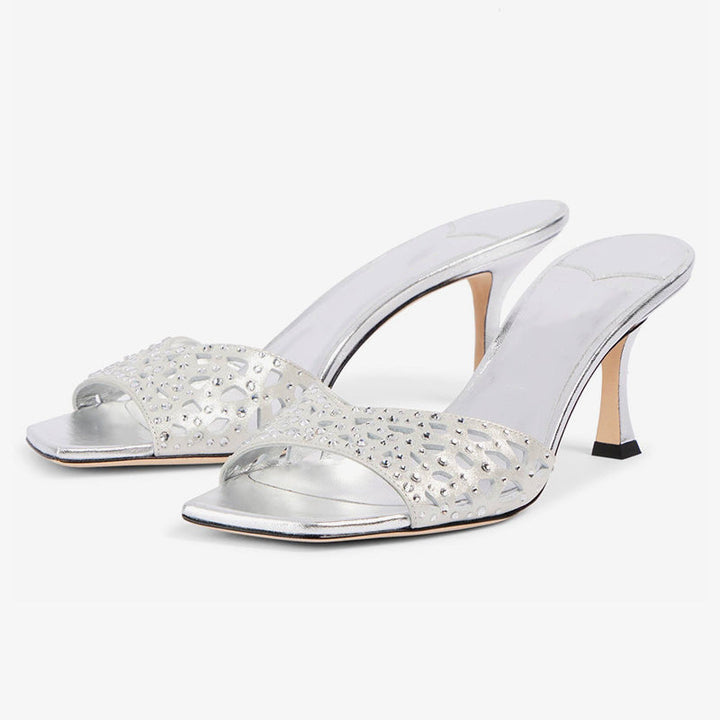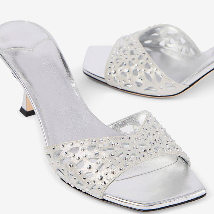 Crafted from silver satin with angular perforations, these Italian-made mules feature a square open toe, leather lining and sole, and a sculpted heel for a sleek, modern finish.