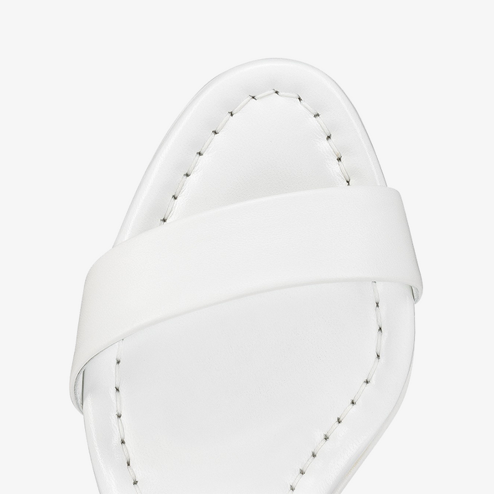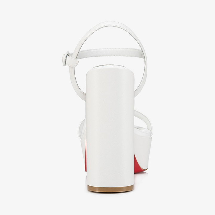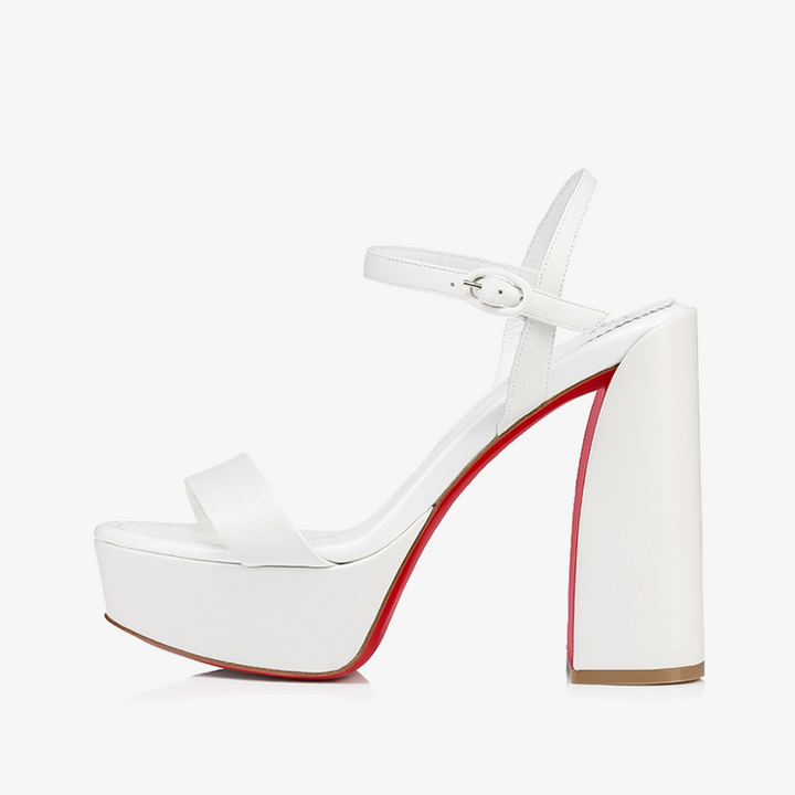 A pump with an urban silhouette, this design features a square, 140 mm angled heel that creates a bold statement. Crafted in soft calf leather, it has a rounded toe and a daring low-cut vamp, offering a chic, modern look. Two slim straps with a metallic clasp delicately adorn the foot, completing this sophisticated model with subtle yet refined details.