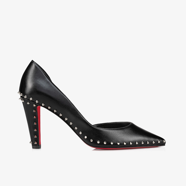 This signature half-pump design offers a bold glimpse of the foot, with mini spikes wrapping the upper and heel for an edgy touch. Set on an 100 mm Cuban heel, this model is crafted in sleek black calf leather, combining contemporary style with distinctive detailing.