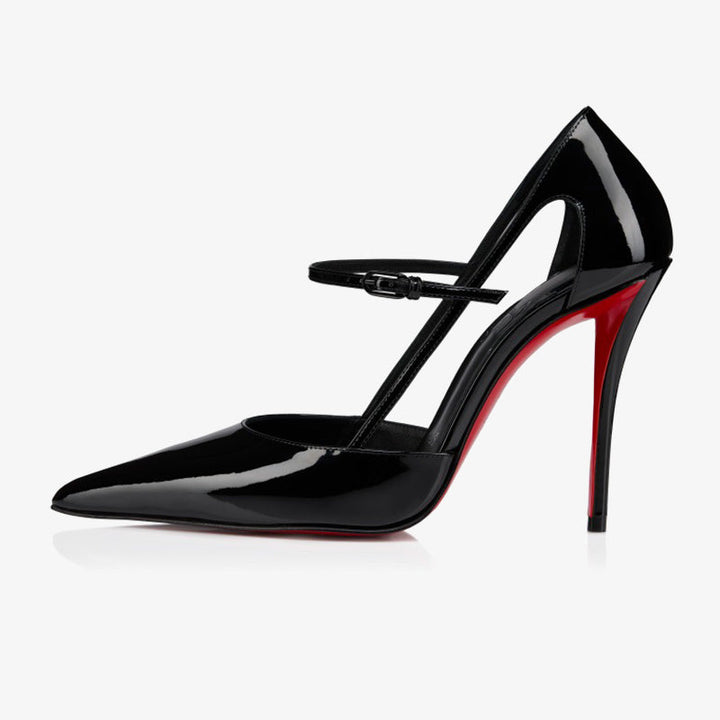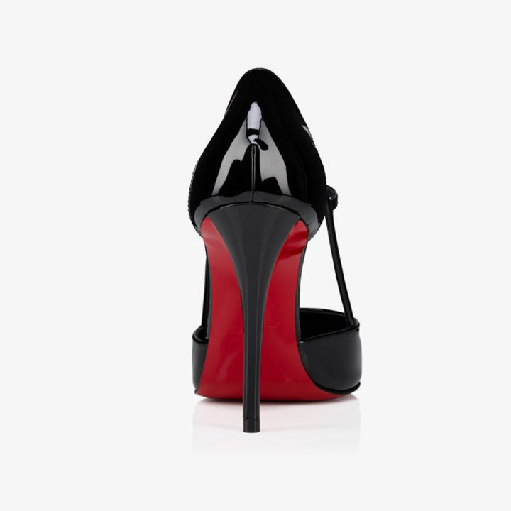 The sleek silhouette of this pump exudes sophistication. Set on a 100 mm stiletto heel, it reveals the iconic red sole and includes a padded insole for added comfort. Crafted in glossy black patent, the design features an open toe and a delicate strap. Thanks to an innovative coating technique, the signature red sole offers exceptional resistance and lasting vibrancy.