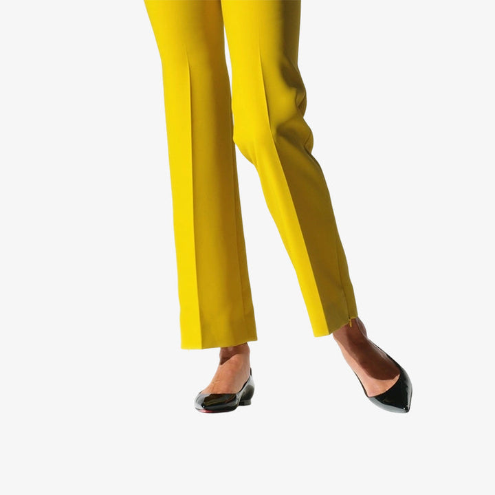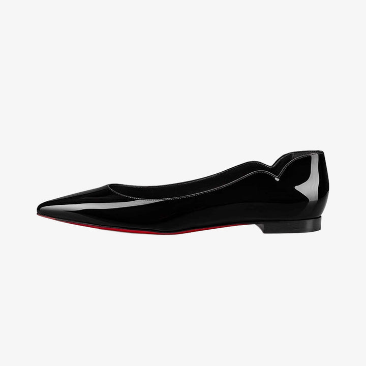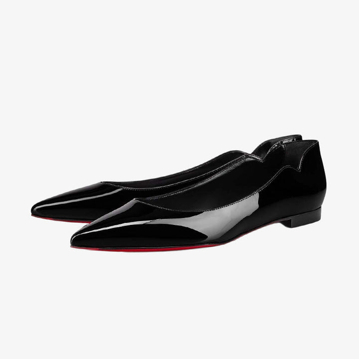 This polished black patent leather flat features a sleek pointed toe, subtle V-shaped ankle cutouts, and a low-top design that elegantly flatters the foot. Clean lines and refined details add a modern urban edge.