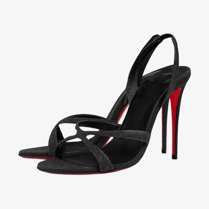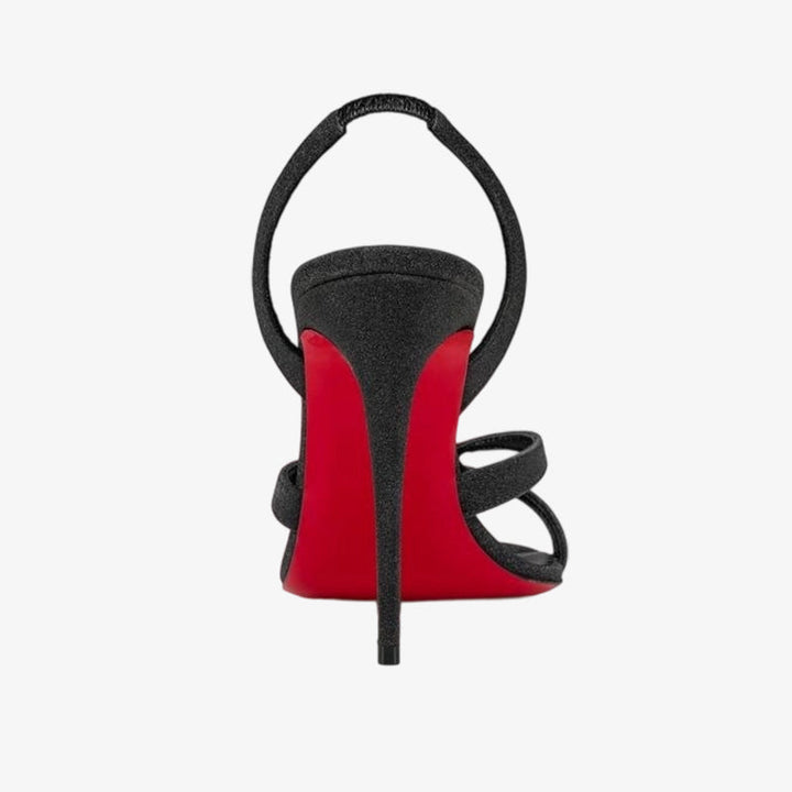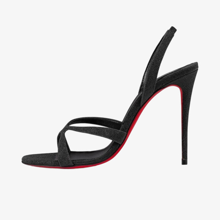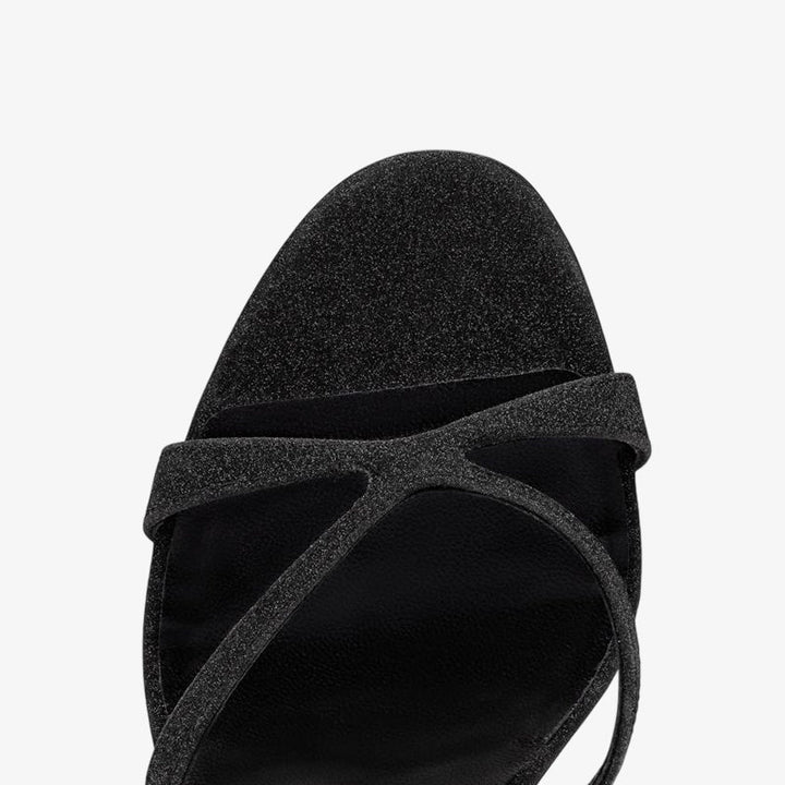 Sleek and elegant, these black glitter calf leather sandals feature crossing straps over the foot, a slender elastic ankle strap, and a balanced heel. A timeless design combining sophistication and style.