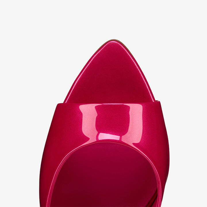This elegant mule features a tapered silhouette in glossy fuchsia patent calf leather, a slim toe-revealing band, a padded insole, and a stiletto heel. Finished with a durable signature red sole that stays vibrant wear after wear.