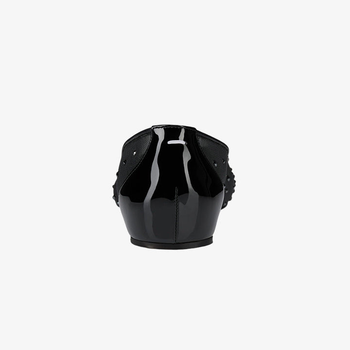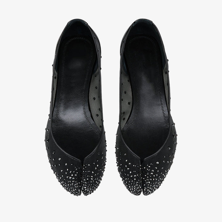 This tapered black flat combines transparent mesh and sleek calfskin, highlighted by a split-toe silhouette and a bold crew neckline. Gradient rhinestones add elegant sparkle, while the signature red sole stays vibrant thanks to an innovative coating.