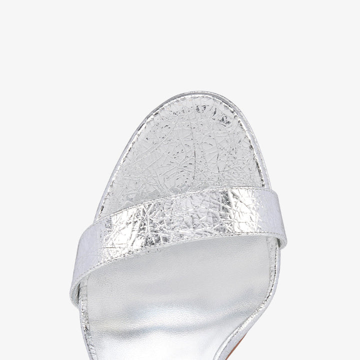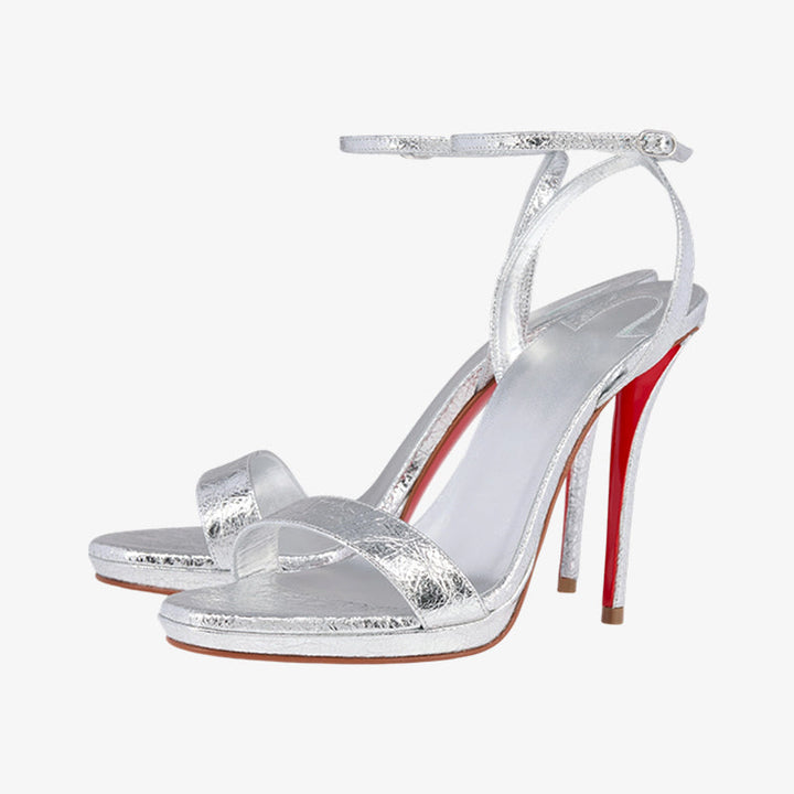 This sandal features an elegant silhouette with a stiletto heel, open toe, and slim heel strap. Crafted from silver calf leather, it includes a insole and a durable, vibrant red sole for a striking finish.