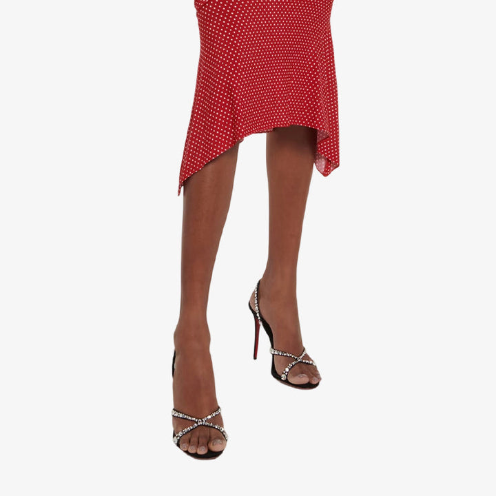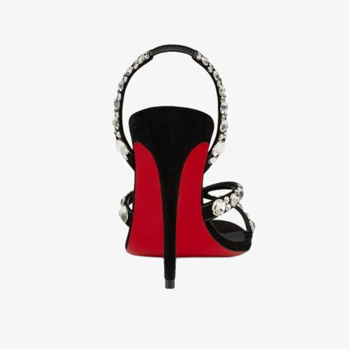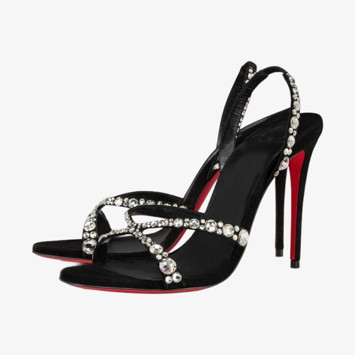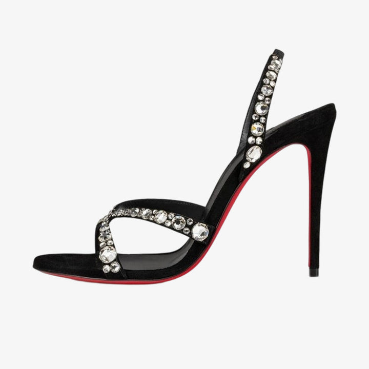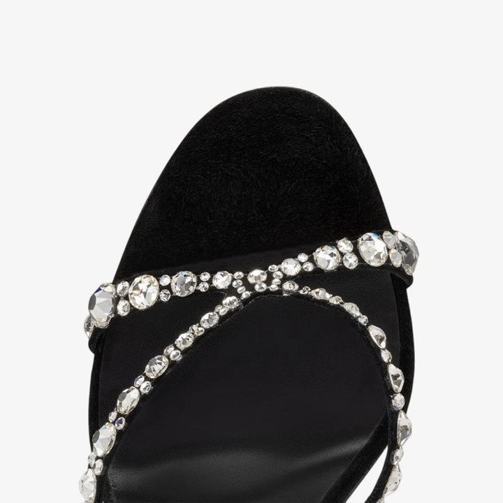 This sleek black sandal in soft calf suede features delicate front crossover straps and a slender elastic ankle strap. Finished with shimmering strass in varying sizes, it subtly reveals the foot for an elegant, refined look.