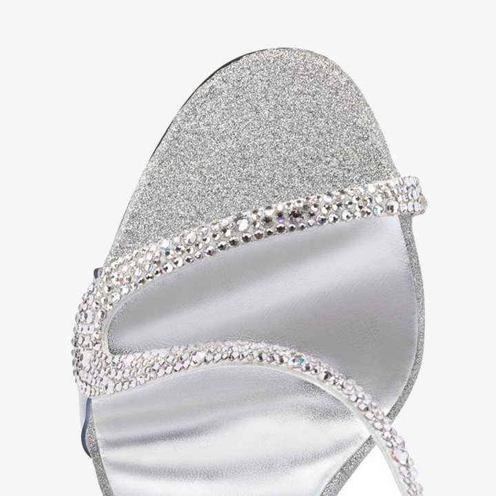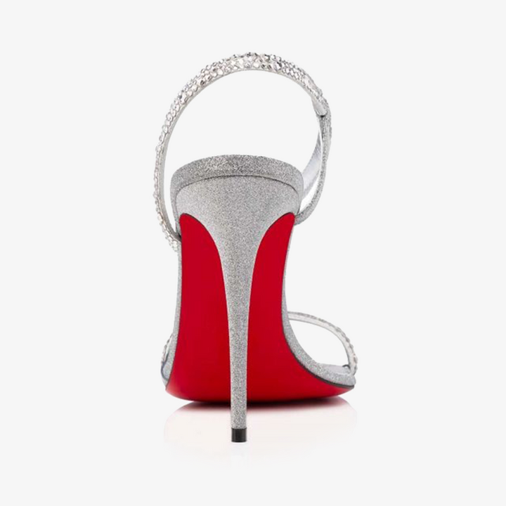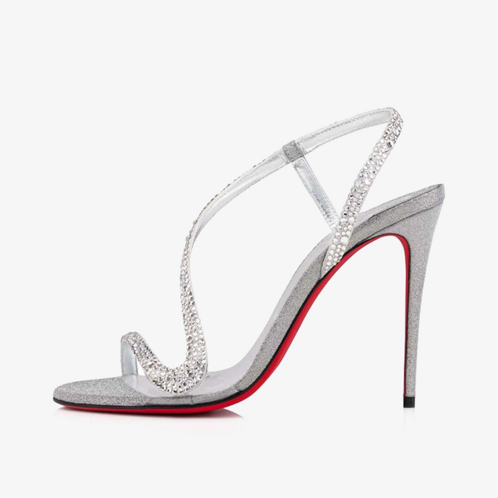 Showcasing both creativity and craftsmanship, this sandal features a narrow strap that elegantly snakes around the foot. Crafted in soft suede, adorned with strass and grey glitter calf leather, it is set on a 100 mm stiletto heel. Discreet finishing touches complete this sleek and sophisticated design.