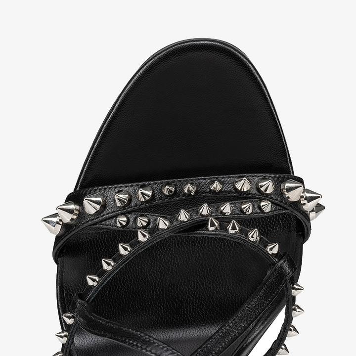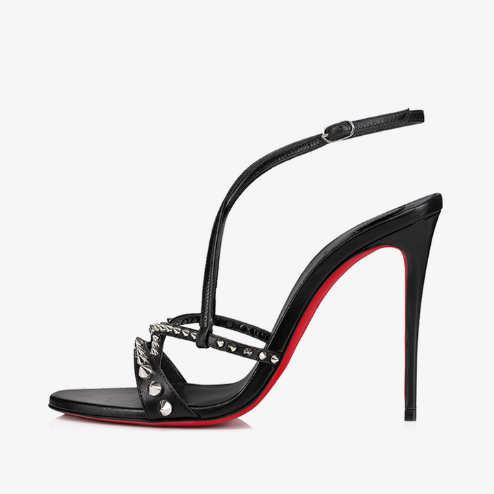 This elegant leather sandal features a 100 mm stiletto heel and a softly curved arch, creating a flattering silhouette. Thin straps crisscross the foot, wrapping around the ankle and adorned with a scattering of spikes on the front straps. The iconic red sole contrasts beautifully with the black calf leather upper, while the almond-shaped toe adds a sleek, sophisticated finish.
