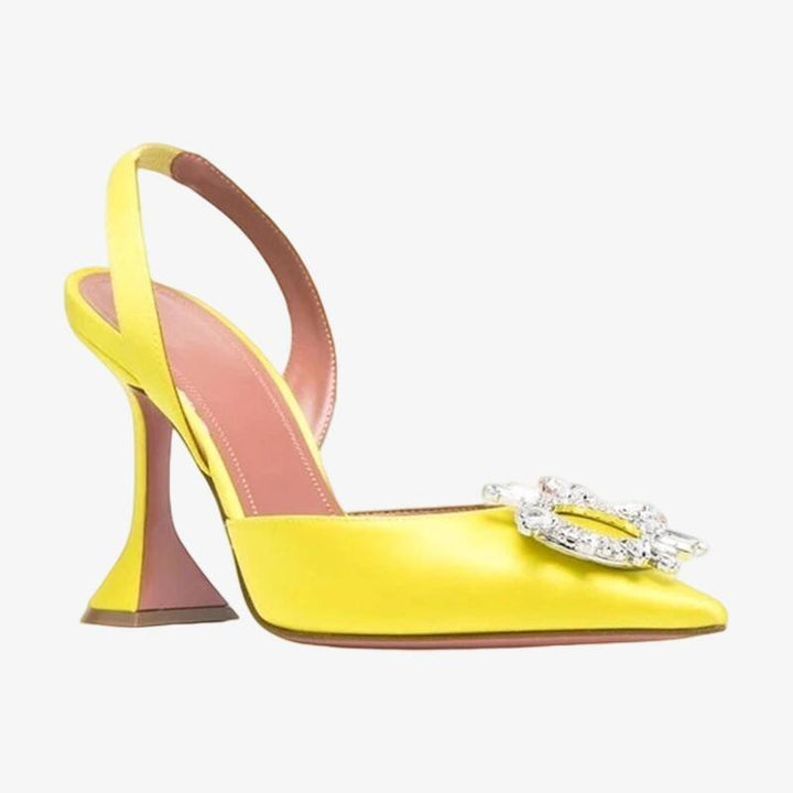 Make a radiant statement in these vibrant yellow satin pumps, featuring dazzling crystal embellishments and a sleek pointed toe. The slingback strap ensures a secure fit, while the 95mm heel adds elegant height with timeless sophistication.