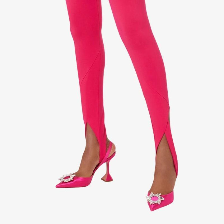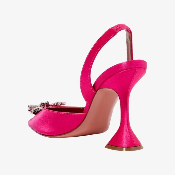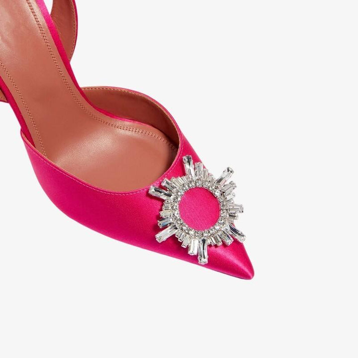 These gorgeous rose red satin slingbacks, embellished with a sparkling crystal brooch and featuring an elegant pointed toe, make a bold statement. The 95mm heel height provides a refined heel height, while the elastic slingback strap ensures a secure and comfortable fit.