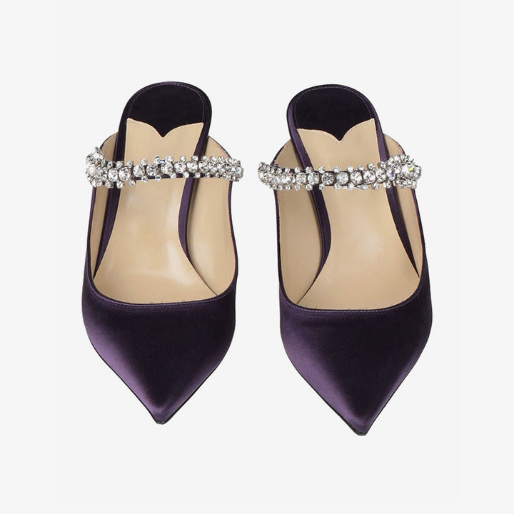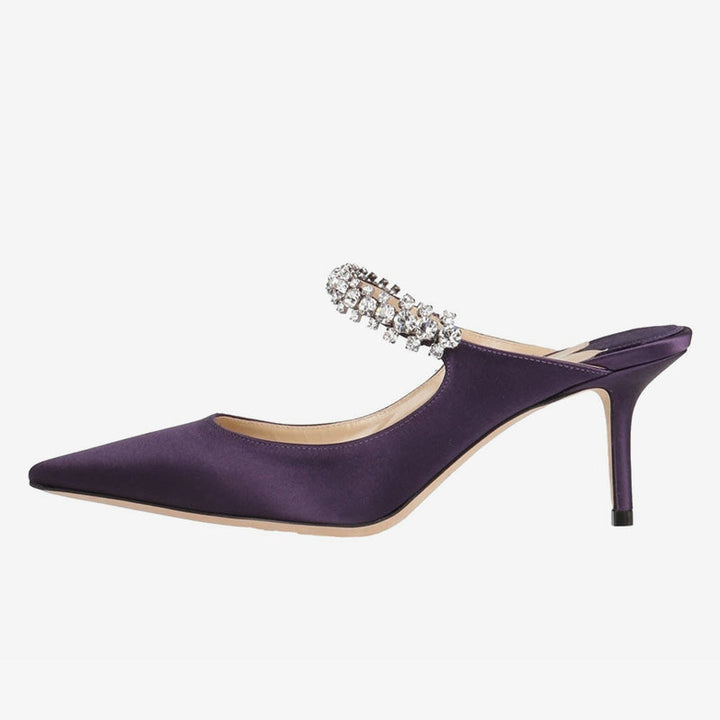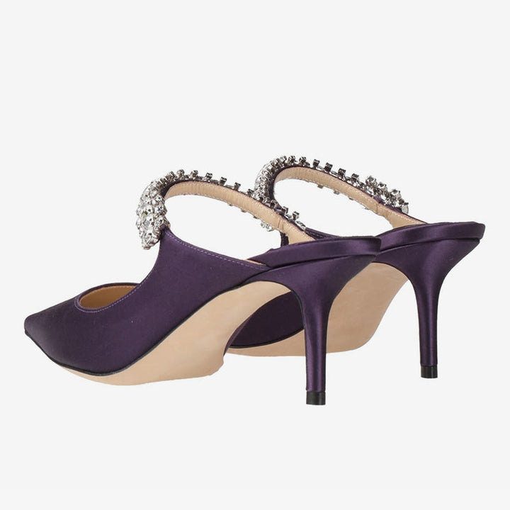 Elegant and bold, these satin mules feature crystal detailing and appliqué accents. With a pointed toe, spike heel, and leather lining and sole, they offer a chic and refined look. The 65mm heel adds just the right amount of height for a sophisticated finish.