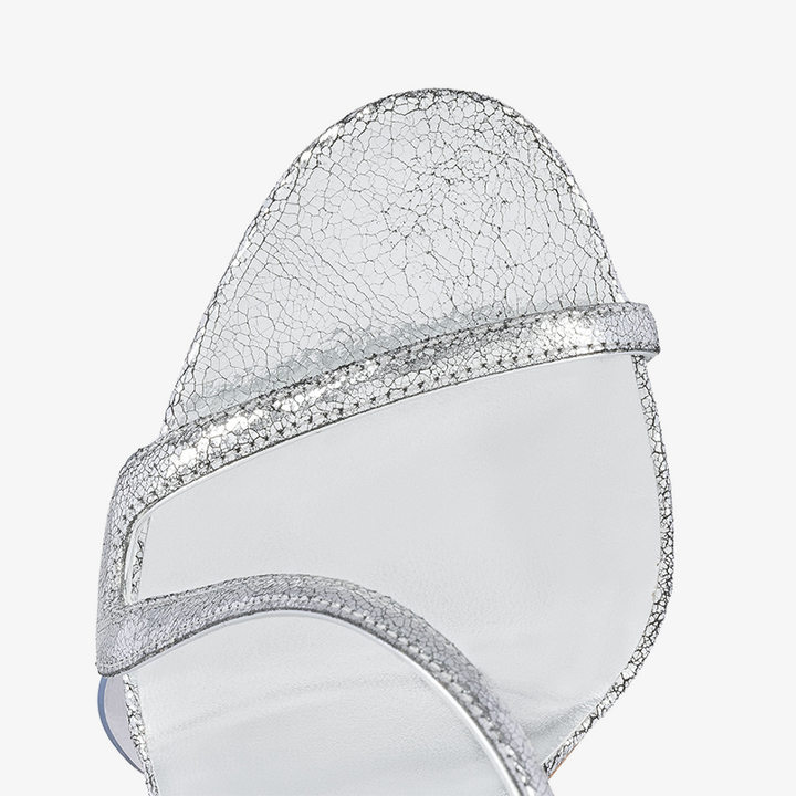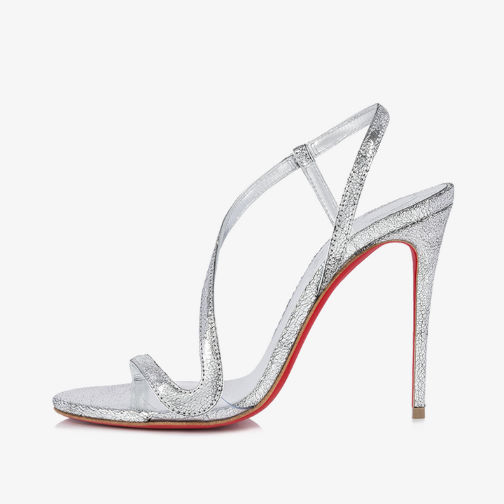 A reflection of sophistication, this sandal features a slender silver laminated leather strap that gently wraps around the ankle. Set on a 100 mm heel, this refined design showcases exceptional craftsmanship and technical savoir-faire. Delicate and elegant, it is enhanced with intricate details, making it a timeless addition to any wardrobe.