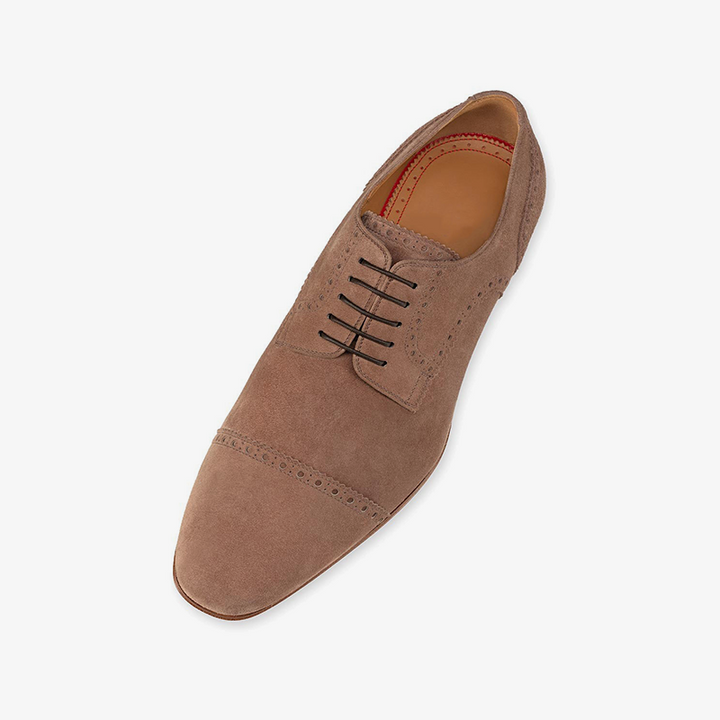 A refined take on the classic derby, this shoe features a rounded toe and a slim, timeless sole. The upper is adorned with subtle perforated top-stitching outlining the toe, heel, and laces. Crafted from soft calf leather and suede, this sophisticated design pairs beautifully with tonal laces and sole, adding a touch of elegance to any look.