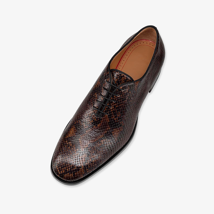A timeless Oxford shoe that elevates any smart outfit. Crafted from embossed Calf Paris leather that mimics the texture of real python, this shoe combines classic styling with a modern twist. Featuring a stacked heel, lace-up fastening, and the signature red sole, it’s the perfect choice for those who appreciate both sophistication and edge.