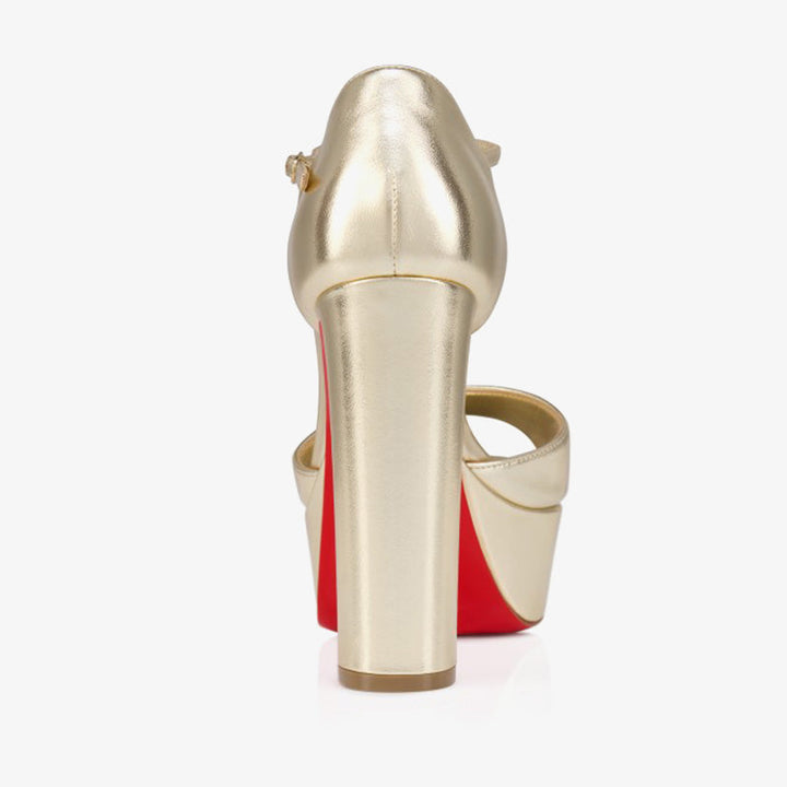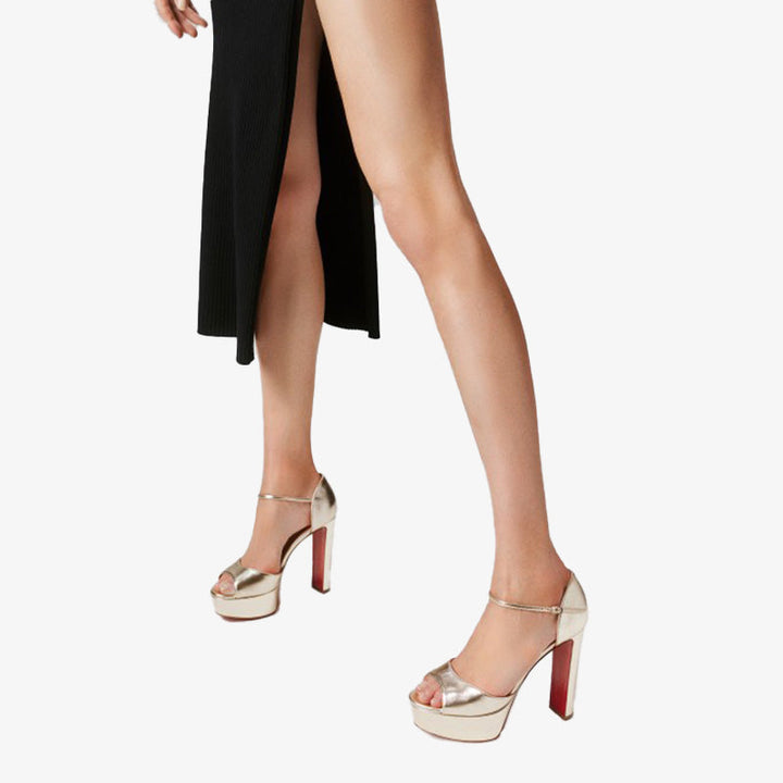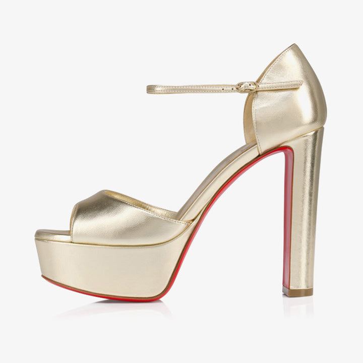 These stunning platform sandals are meticulously crafted from luxurious platinum laminated calf leather, offering a sleek, metallic finish. The open toe design elegantly showcases the foot, while the delicate slim ankle strap ensures a secure and flattering fit. Set atop a bold 140mm square heel, they provide both height and stability, making these sandals a perfect combination of style, comfort, and modern elegance for any special occasion.