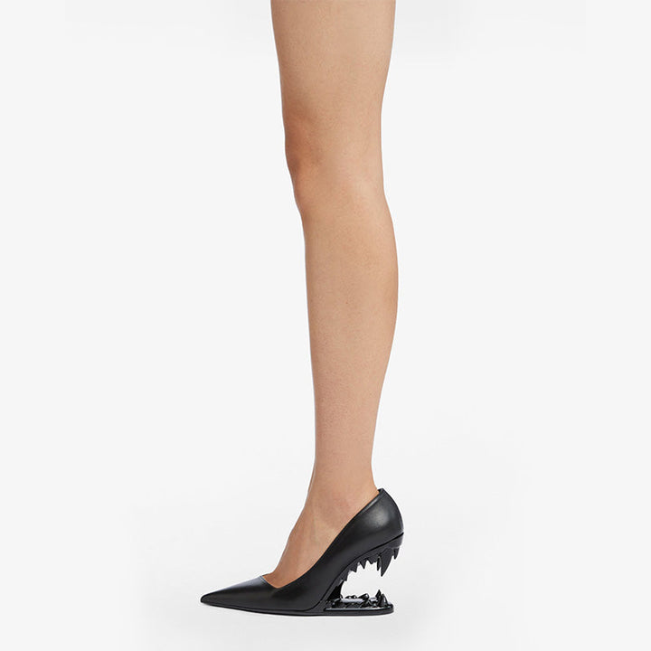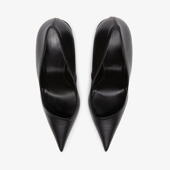 Sleek and architectural, these black leather pumps feature a tone-on-tone sculpted heel and an asymmetrical vamp. A pointed toe and smooth leather insole complete the sharp, modern profile.Upper: 100% calf leather