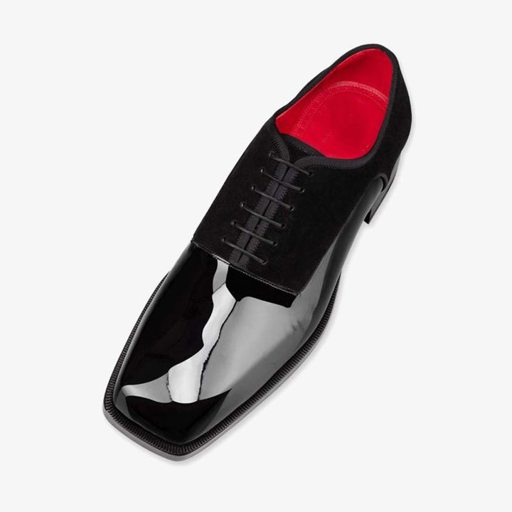 Featuring a distinctive square toe and sartorial lines, this elegant city shoe is designed for optimal comfort with a wider fit. Crafted from black patent leather and veau velour suede, it is framed with grosgrain trim for a refined touch. A notched, sculpted welt and thick sole add bold attitude, making this model a striking addition to any wardrobe.Upper: 100% patent calf leather and suede