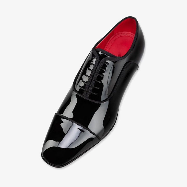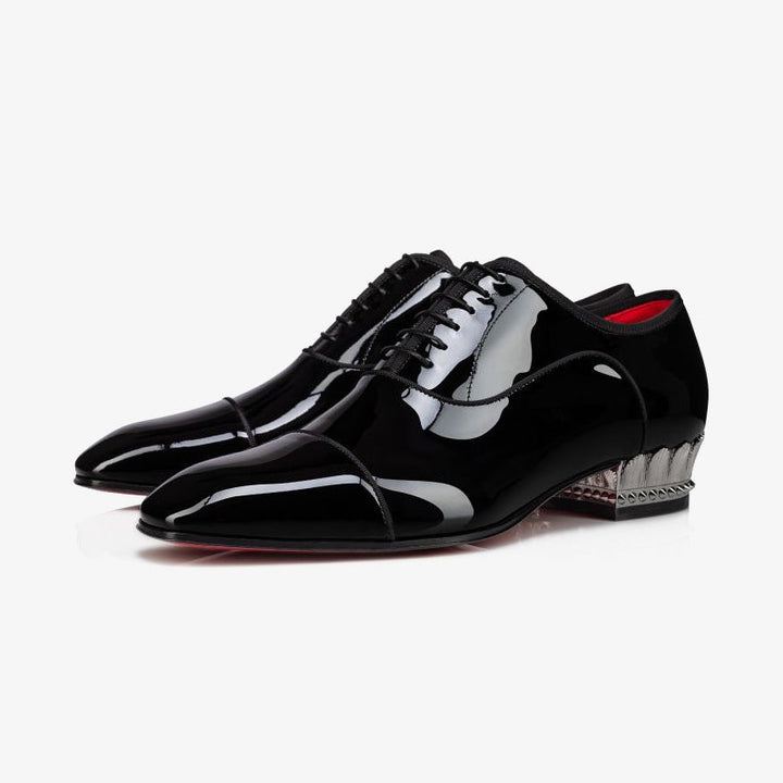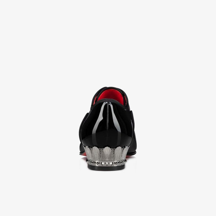 A modern masterpiece, this shoe blends creativity with elegance. Featuring a metallic heel inspired by Egyptian columns, it is surrounded by signature spikes that evoke the iconic red lipstick case. Crafted entirely in black patent leather, this sleek model showcases clean lines and is finished with a refined grosgrain ribbon trim.Upper: 100% patent calf leather