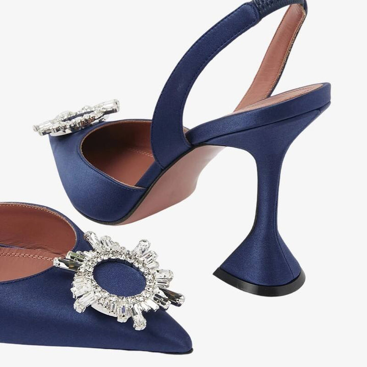Like moonlight dancing on midnight waves, these navy satin slingbacks capture deep-sea mystery in every step. The mirror-polished crystal buckle shatters light into a thousand star-like fragments, while the architectural 95mm heel lifts your silhouette with liquid grace.