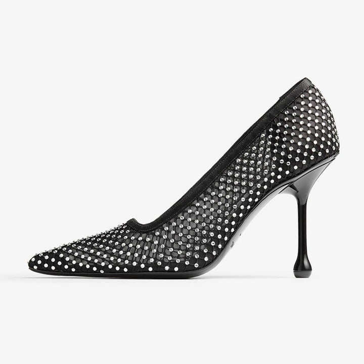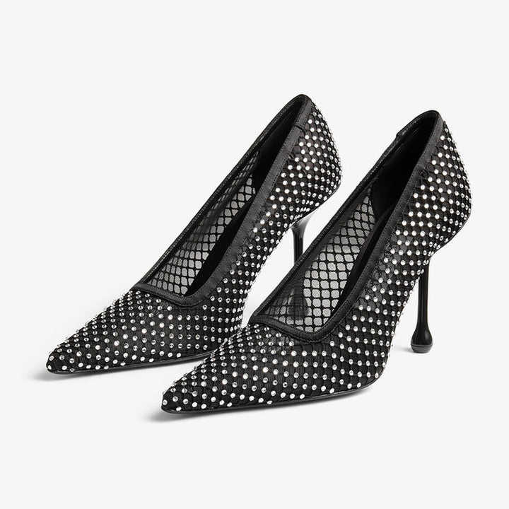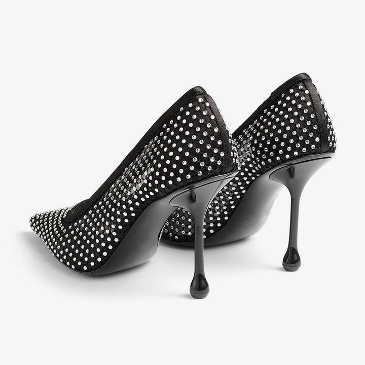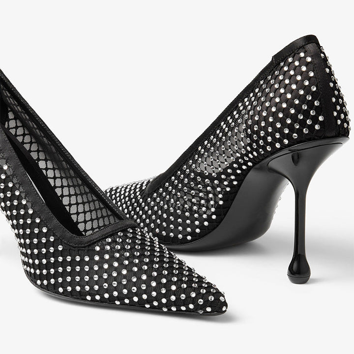Black Satin Crystal Mesh Drop-Heel Pumps