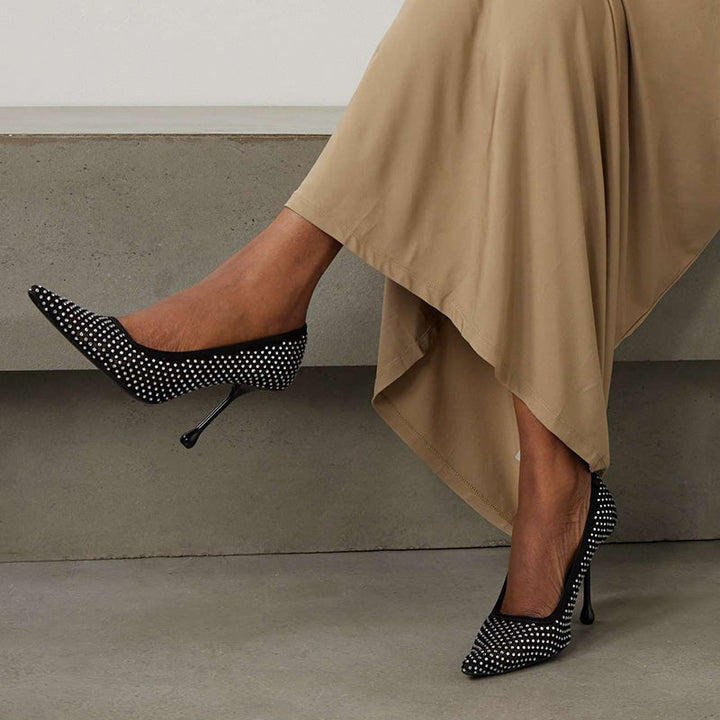 These modern pumps elevate the classic black design with a contemporary drop heel and a square-cut vamp. Crafted from satin and crystal-embellished mesh, they add a glamorous and sophisticated touch to your wardrobe, perfect for making a bold statement at any.The heel height of this pair is 100mm.