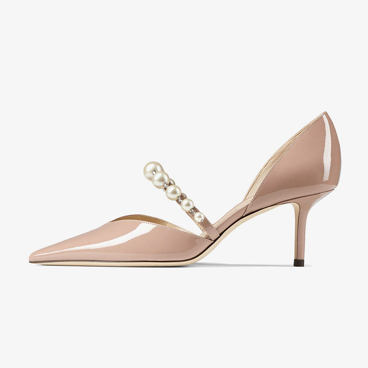 These nude patent leather pumps exude sophistication with their sleek pointed-toe design and slim 60mm heels. Defined by a strap of glossy white pearls and crystals, the open sides and arch strap add modern elegance, making them perfect for both day and evening occasions.